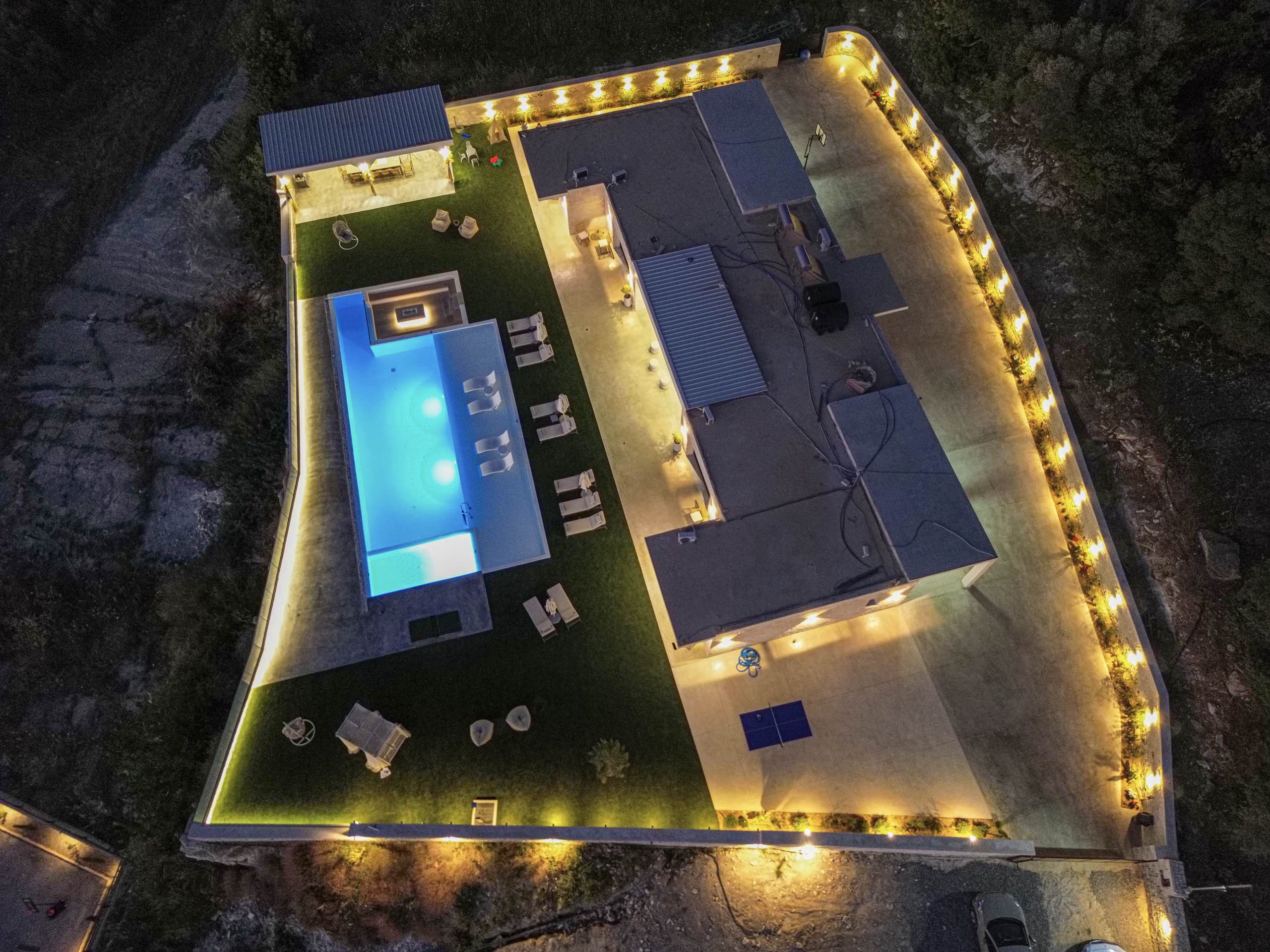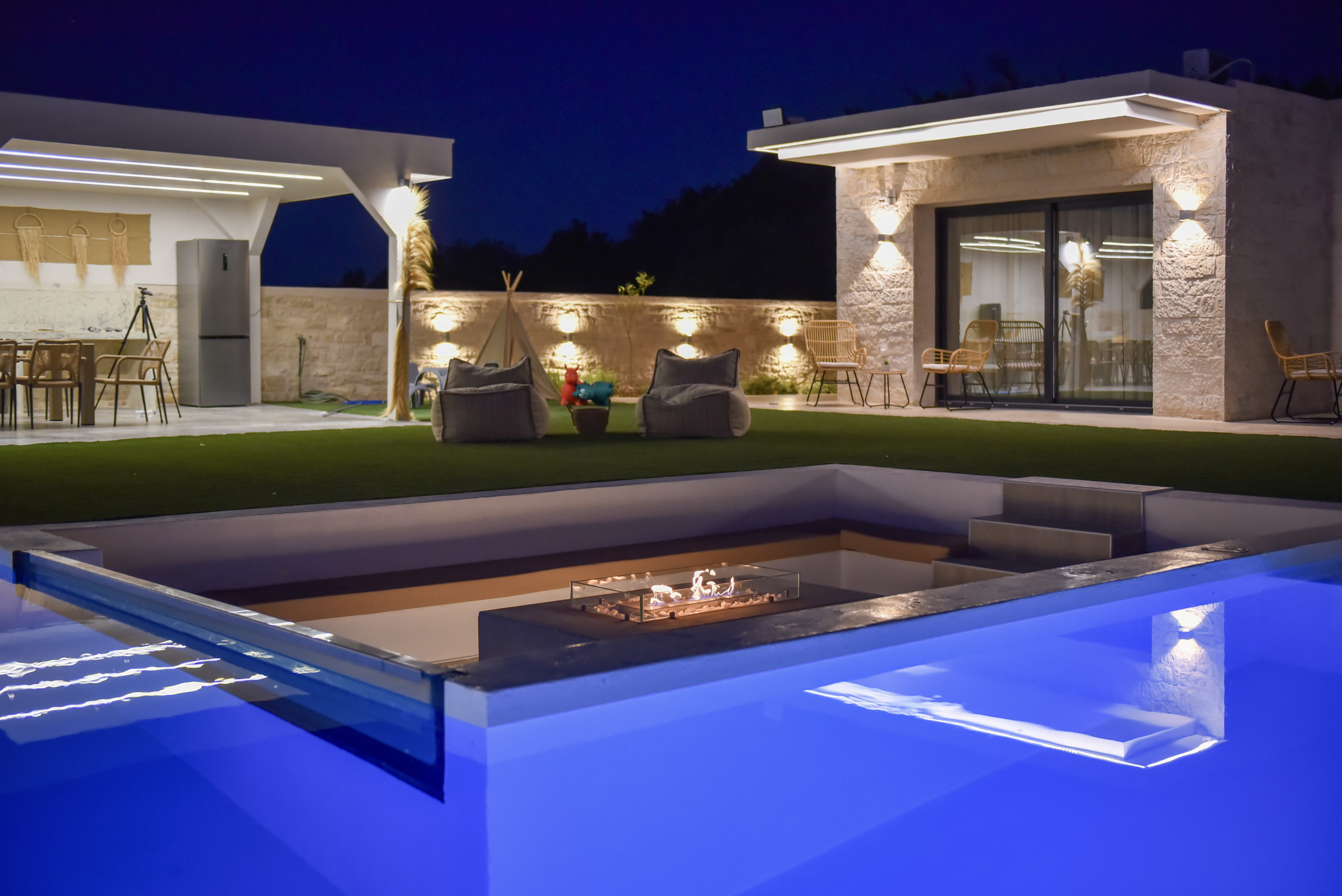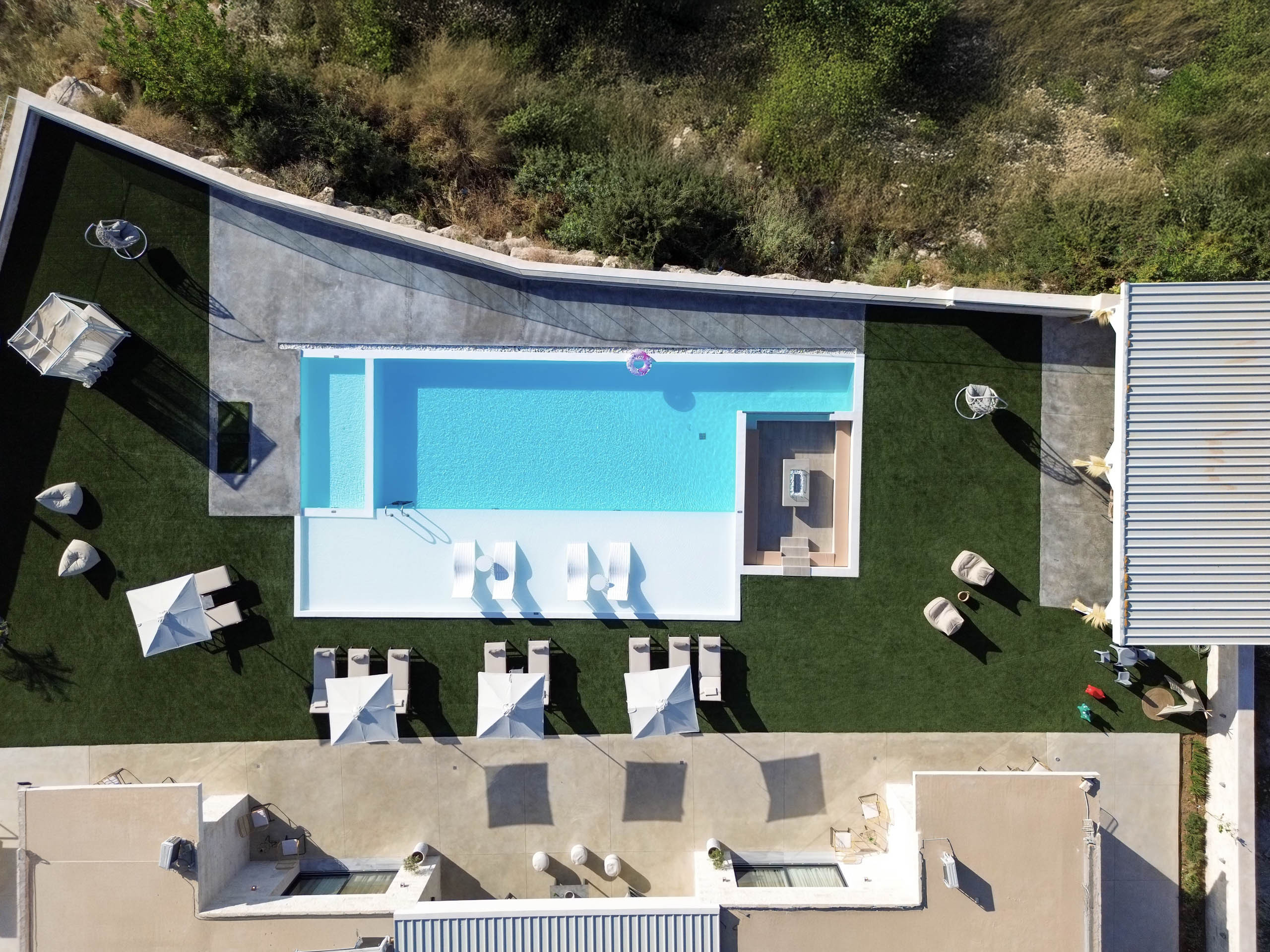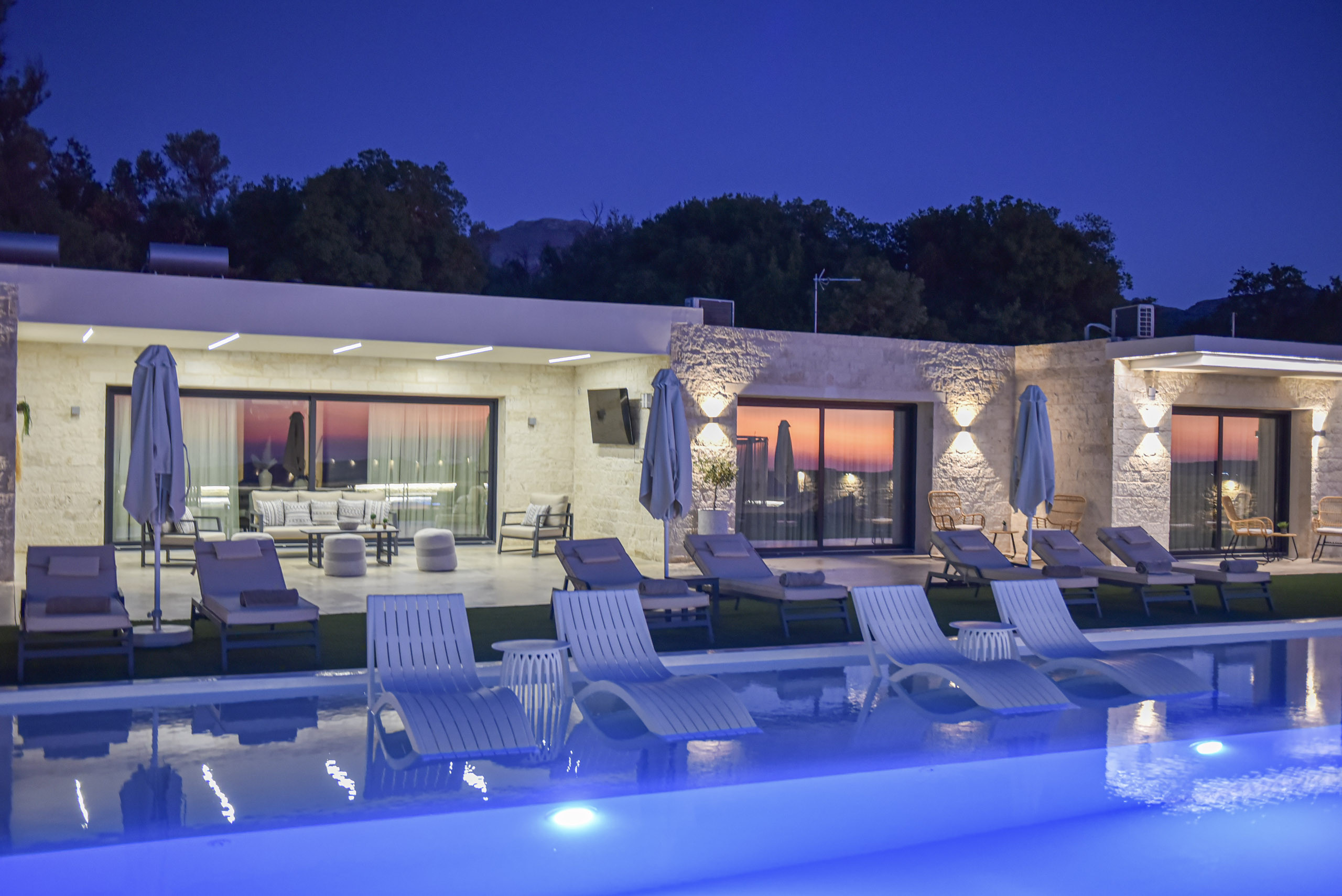 Der Außenbereich von Villa Elira ist eine sorgfältig gestaltete Umgebung für Entspannung und Genuss, umgeben von Natur. Der 75 m² große Swimmingpool dominiert diskret den Raum und wird von bequemen Sonnenliegen umrahmt – einige im Wasser versenkt für ultimative Erfrischung, andere unter eleganten Sonnenschirmen, ideal für lange Stunden der Entspannung.