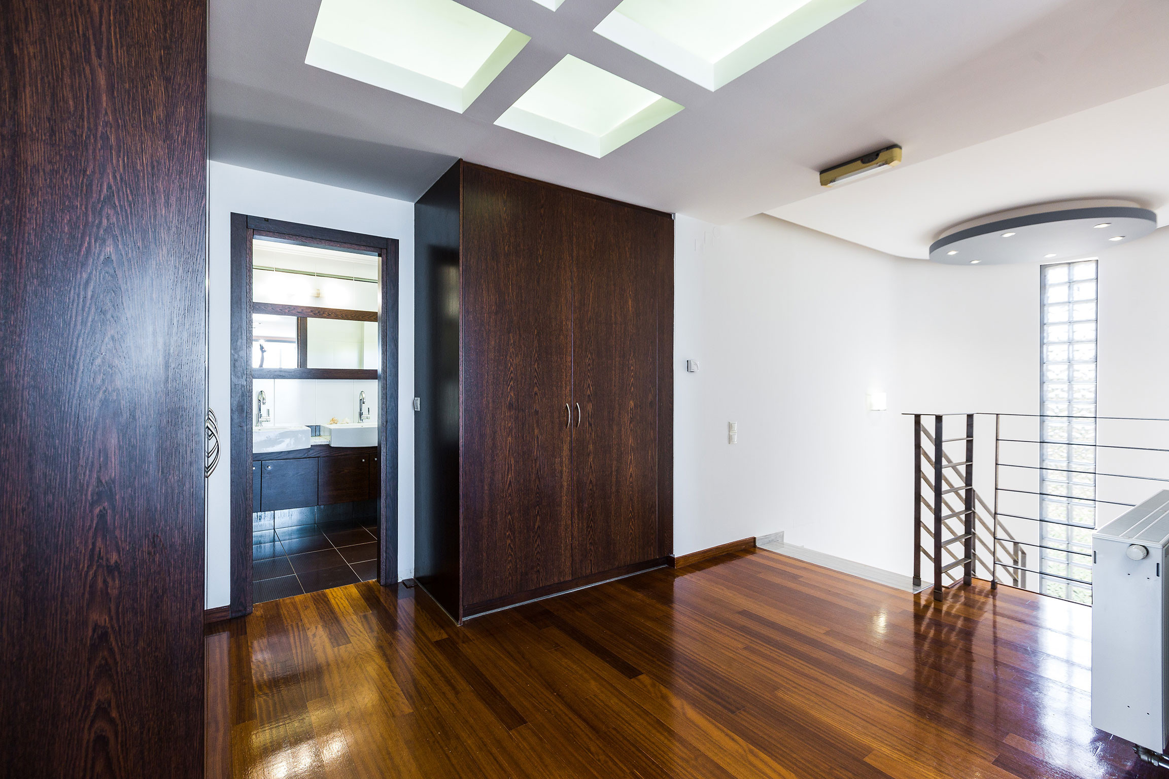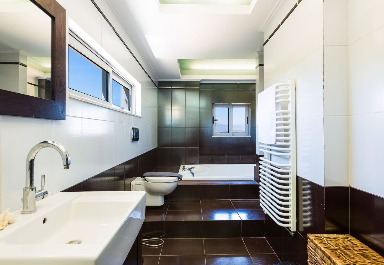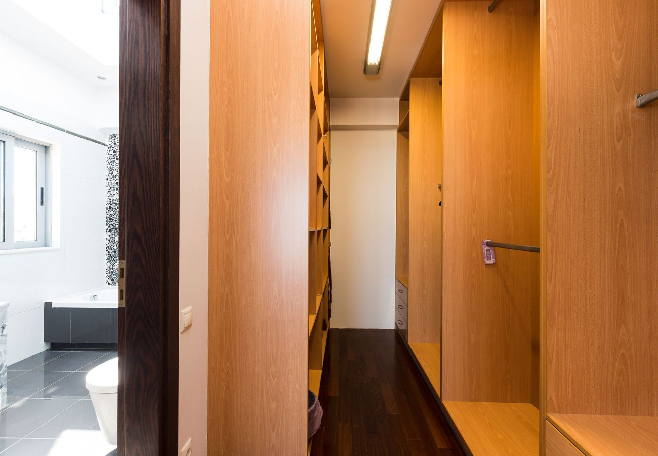 Steigen Sie die Treppe zum ersten Stock hinauf und enthüllen Sie einen Flur, der mit einer Waschmaschine, Fitnesseinrichtungen und einer Sitzecke ausgestattet ist. Das Hauptbadezimmer mit Whirlpool befindet sich ebenfalls in diesem Stockwerk. Drei Schlafzimmer schmücken diese Etage, darunter ein Hauptschlafzimmer mit einem Kingsize-Bett und einem eigenen Badezimmer sowie zwei zusätzliche Schlafzimmer mit Doppel- und Halbdoppelbetten. Der Keller beherbergt zwei weitere Schlafzimmer mit geräumigen Doppelbetten und bietet direkten Zugang zum Poolbereich, begleitet von einem Badezimmer mit Dusche.