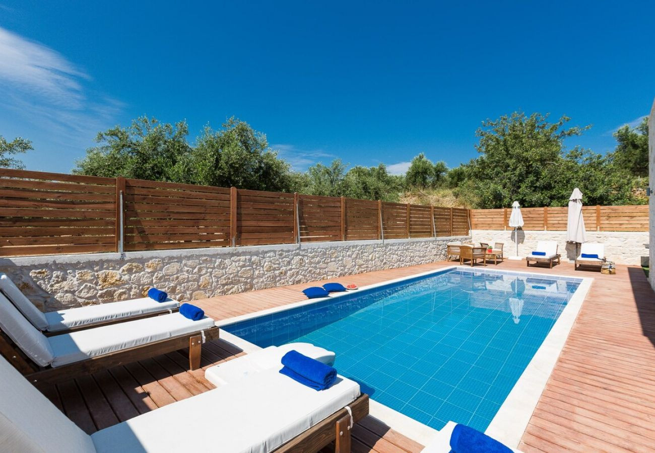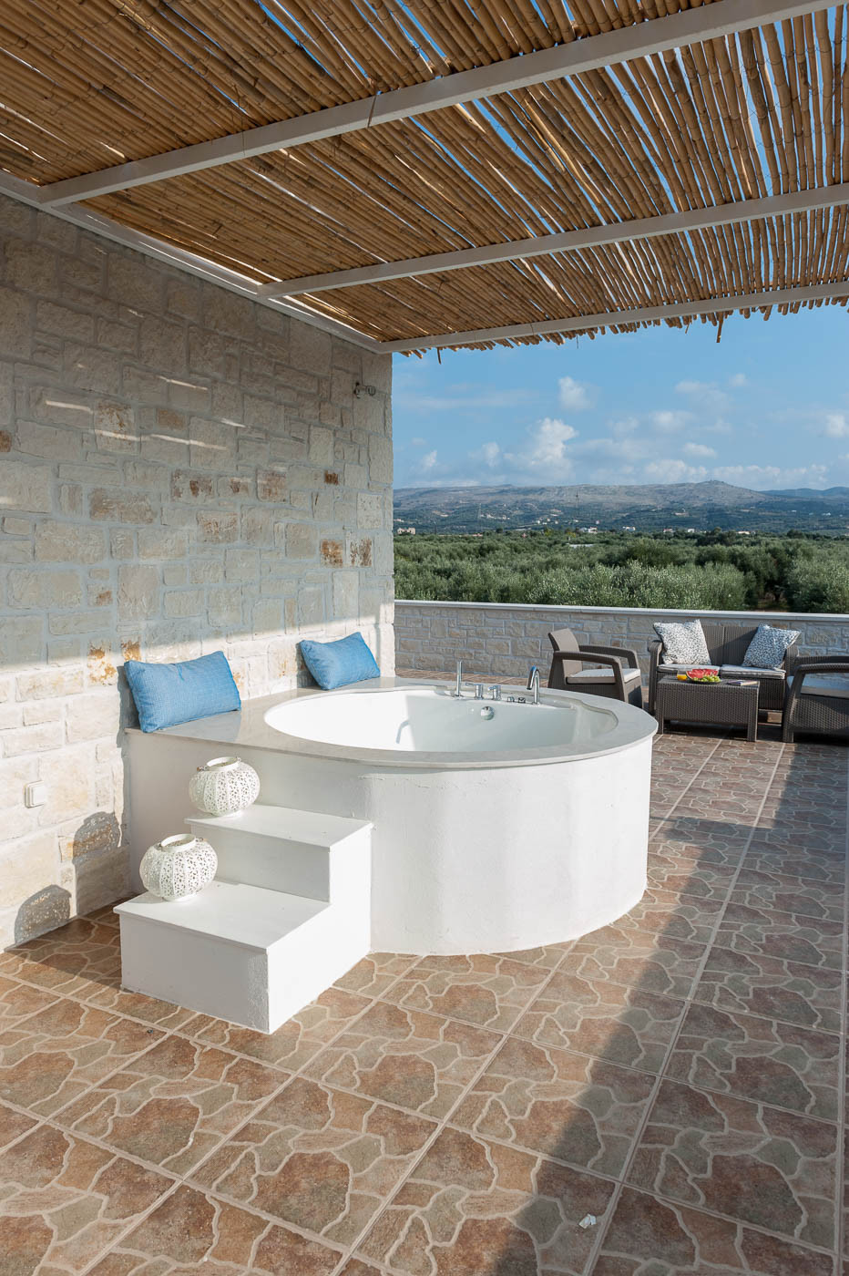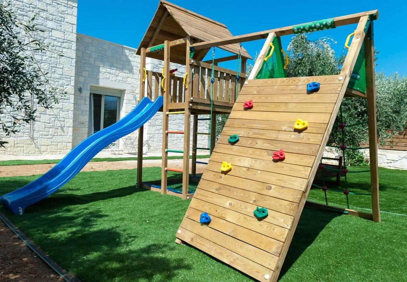 Mit zwei beheizten Pools von je 38 m² (gegen Aufpreis beheizt), zwei Outdoor-Whirlpools mit atemberaubender Meeraussicht, einem Spielplatz und einem Grillbereich fügt sich die Immobilie harmonisch in die wunderschöne Landschaft ein und bietet herrliche Ausblicke auf das unermessliche hellblaue Kretameer, die Stadtlichter und die umliegenden Berge, während die einzigartige und elegante Dekoration Tage und Nächte der Entspannung verspricht.