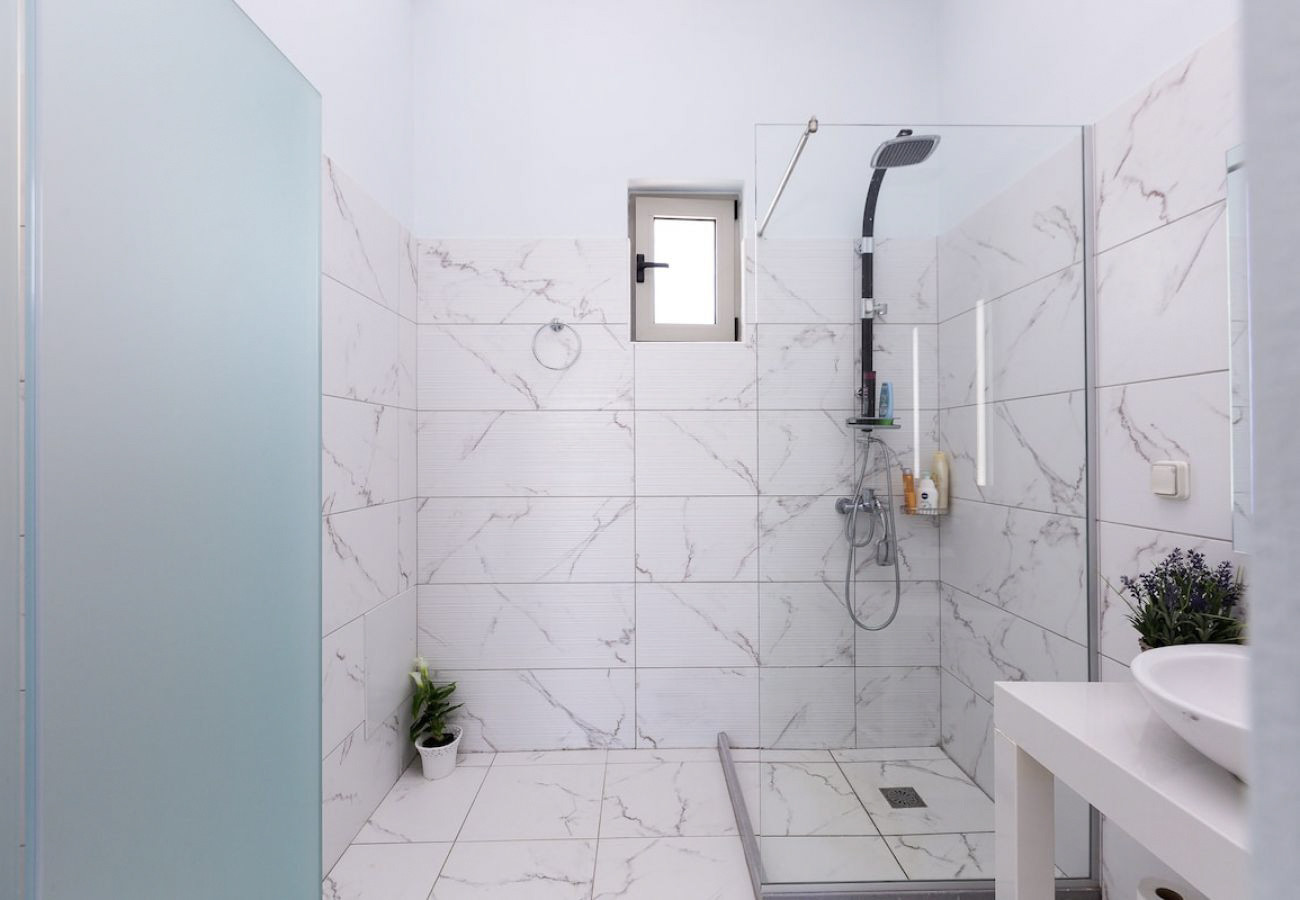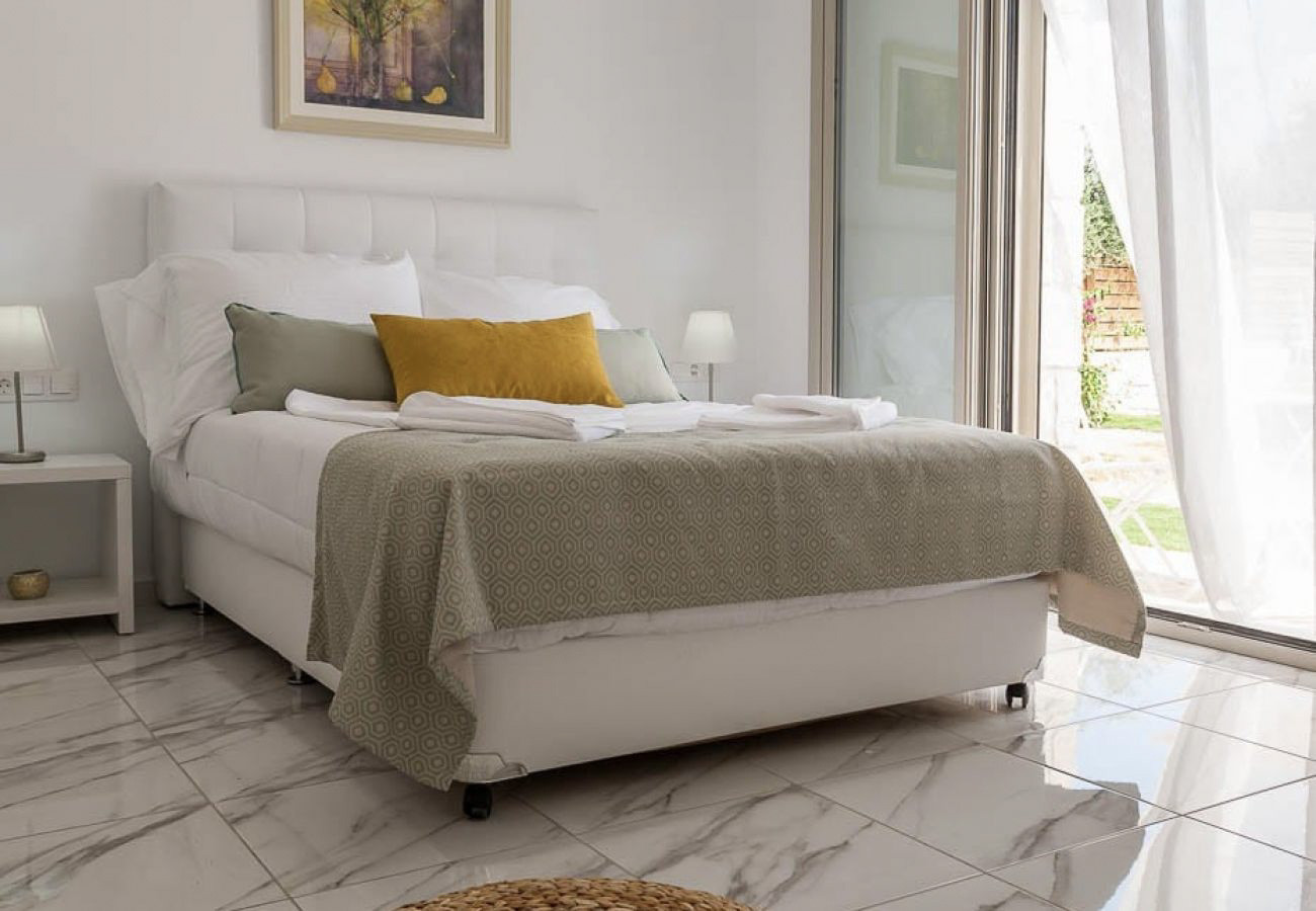Im Erdgeschoss finden Sie zwei große offene Wohn- und Essbereiche sowie zwei voll ausgestattete Küchen mit allen Geräten, die Sie für einen komfortablen Aufenthalt benötigen. Es gibt auch fünf geräumige Doppelschlafzimmer - drei in einer Villa (eines davon mit eigenem Badezimmer) und zwei in der anderen (beide mit eigenem Badezimmer) - wunderschön im romantischen Stil und in beruhigenden Farben eingerichtet. Eine Villa verfügt über ein zusätzliches Badezimmer mit Dusche im Erdgeschoss. Vom Erdgeschoss aus können Sie in den Garten und in den privaten Pool gelangen.