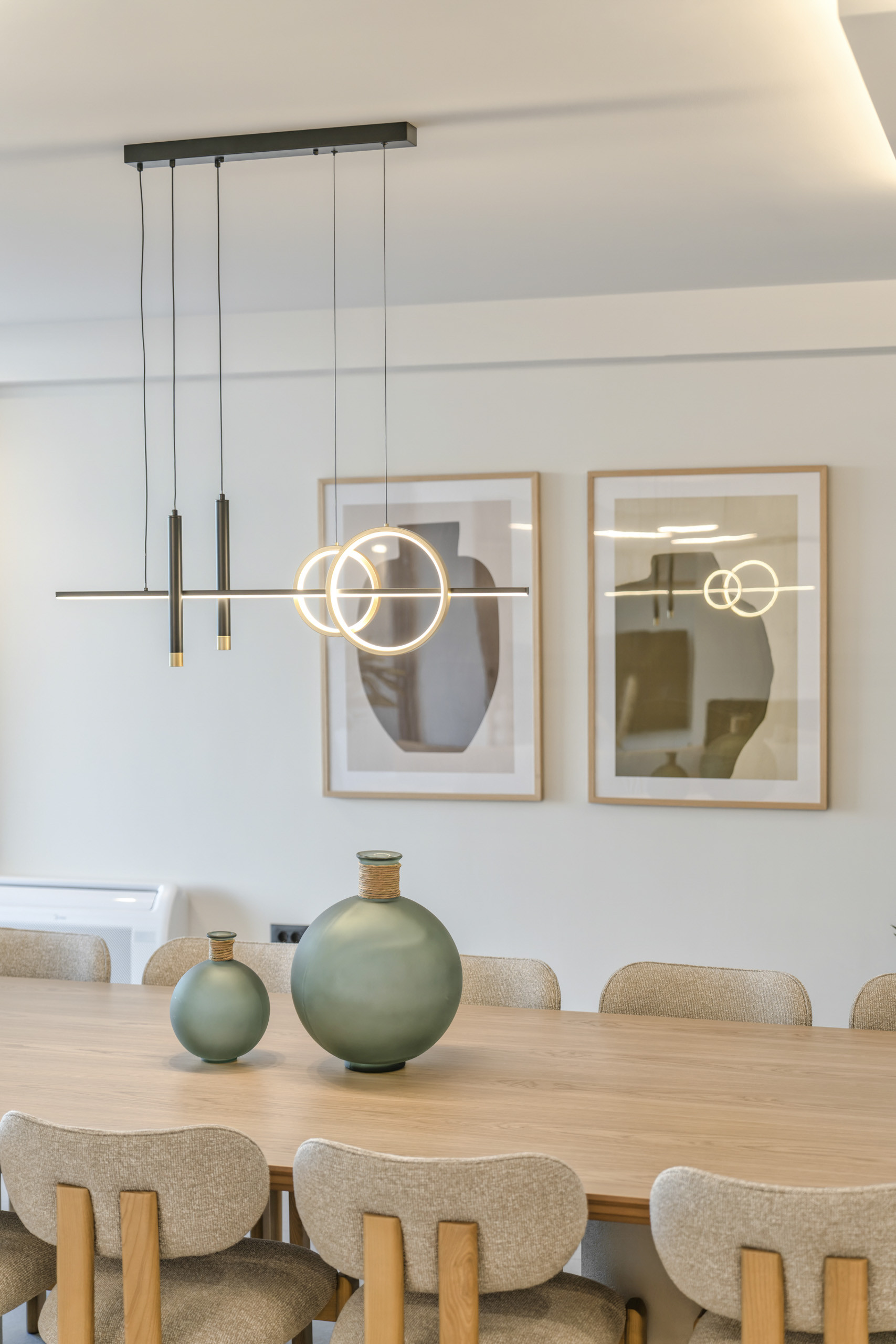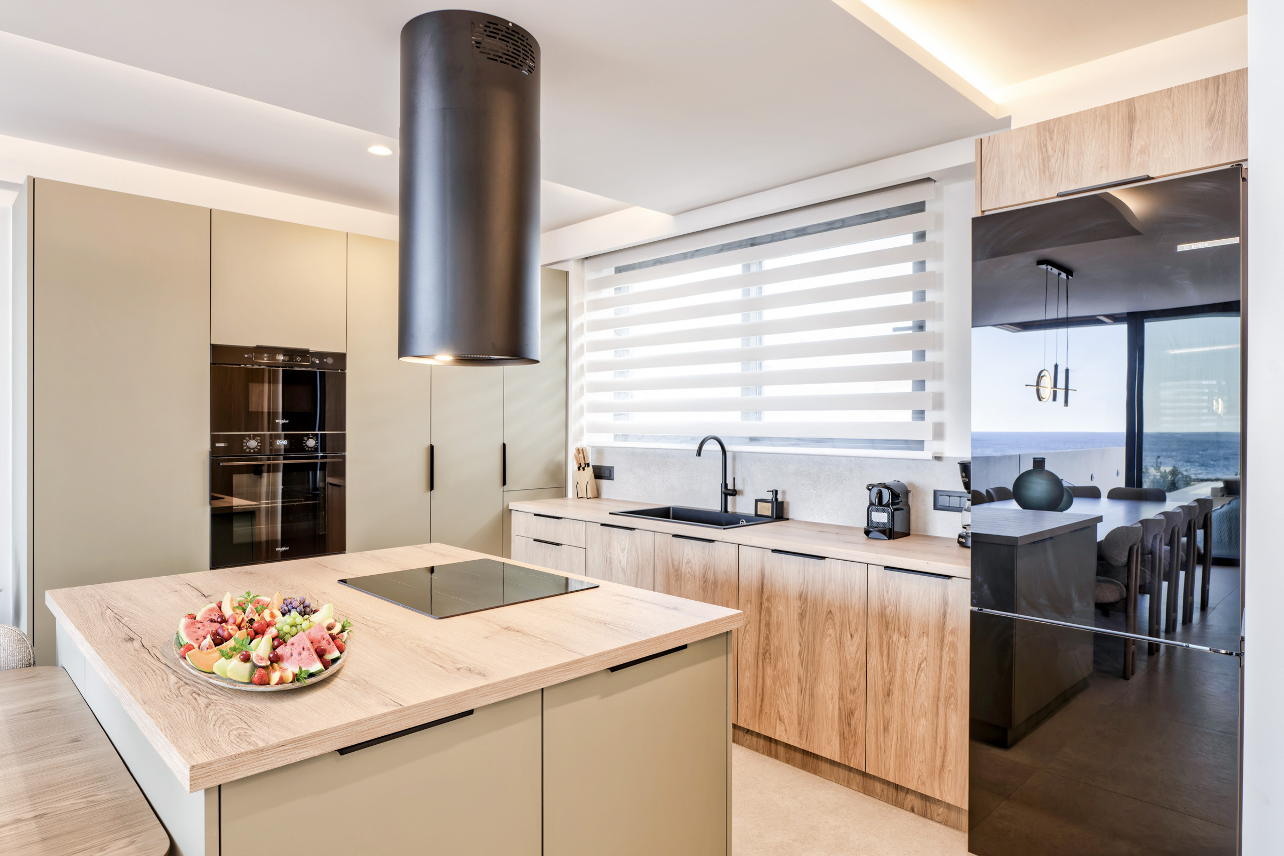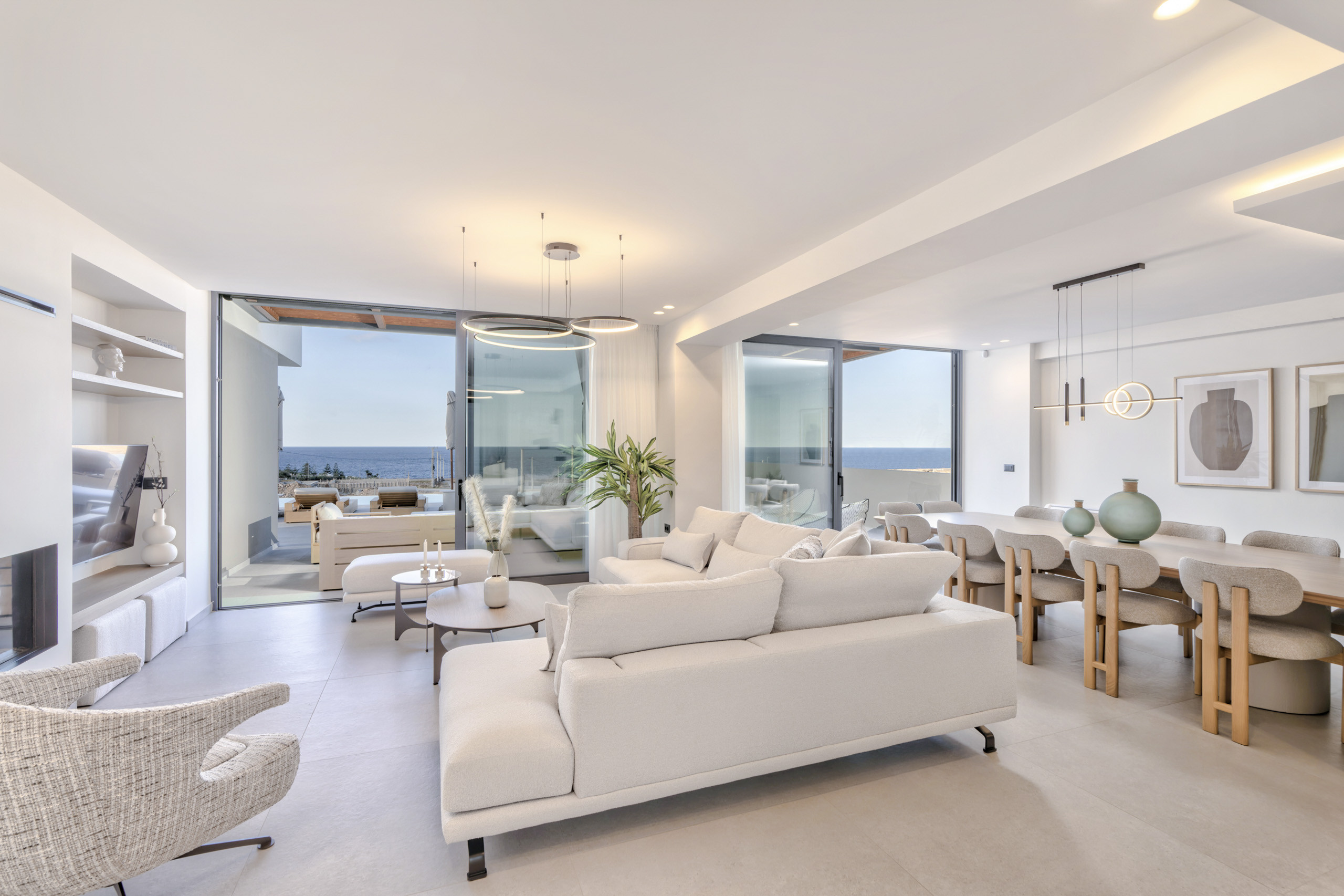 Im Inneren herrscht eine offene Raumgestaltung, wobei der zentrale Wohnbereich ungehinderte Blicke auf das Meer und den Pool bietet, mit einem modernen Kamin und direktem Zugang zu den Außenbereichen. Beim Betreten des Erdgeschosses befindet sich ein praktisches Gäste-WC (ohne Dusche) in der Nähe des Haupteingangs. Die Küche ist vollständig ausgestattet mit modernen eingebauten Geräten, einer Insel mit Kochfeldern und Barhockern sowie einem Kühlschrank.
