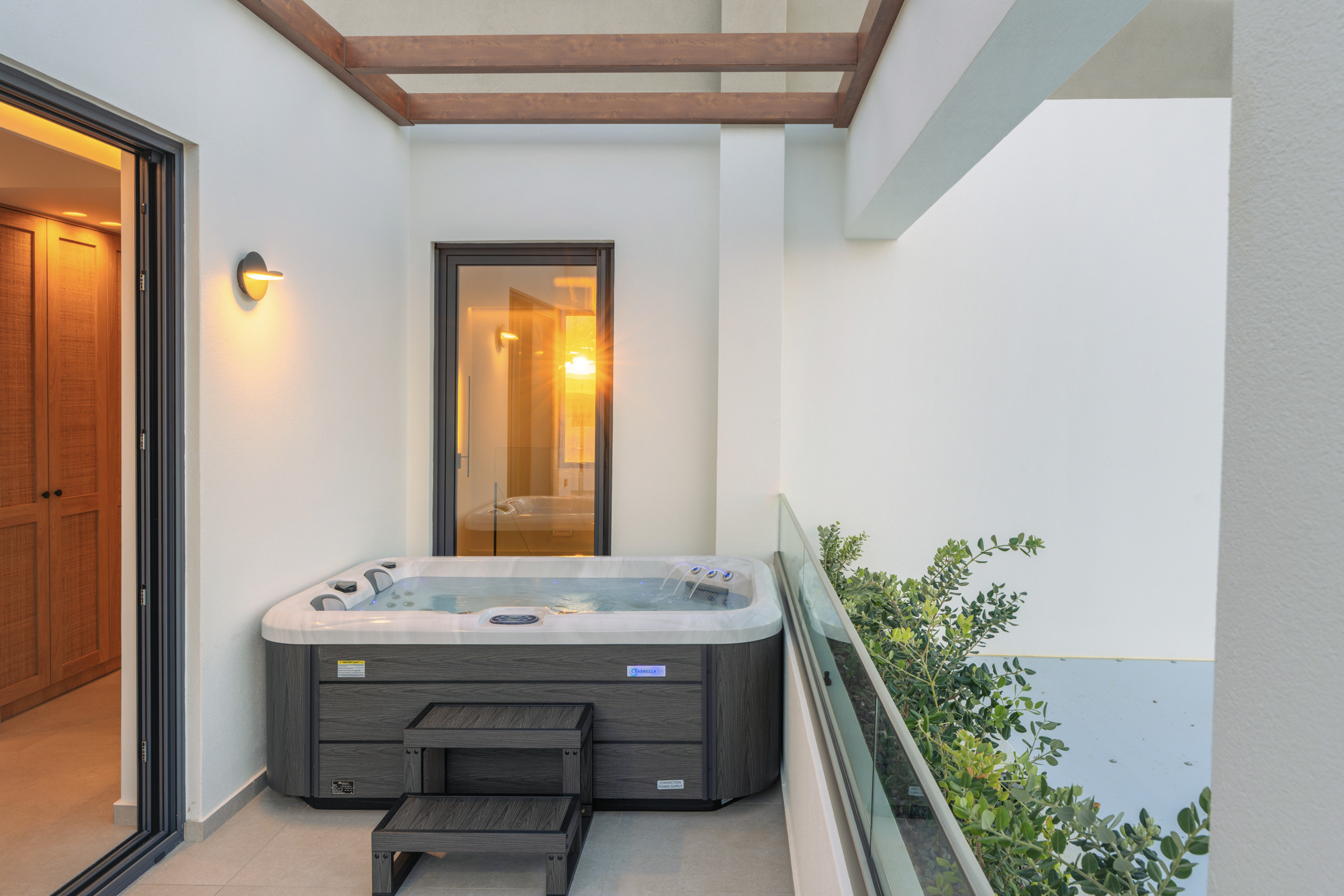 Die Außenanlage der Villa ist fachmännisch gestaltet, um Momente purer Entspannung zu bieten. Der zentrale 70 m² große private Pool (gegen Aufpreis beheizbar) verschmilzt optisch mit dem Horizont und verfügt über einen separaten flachen Bereich speziell für Kinder. Ein Highlight ist die Outdoor-Lounge mit einer zentralen Feuerstelle für atmosphärische Abende unter den Sternen. Barrierefreiheit wird mit einer Einfahrtsrampe priorisiert und gewährleistet einen einfachen Zugang für Gäste mit Mobilitätseinschränkungen und Kinderwagen.