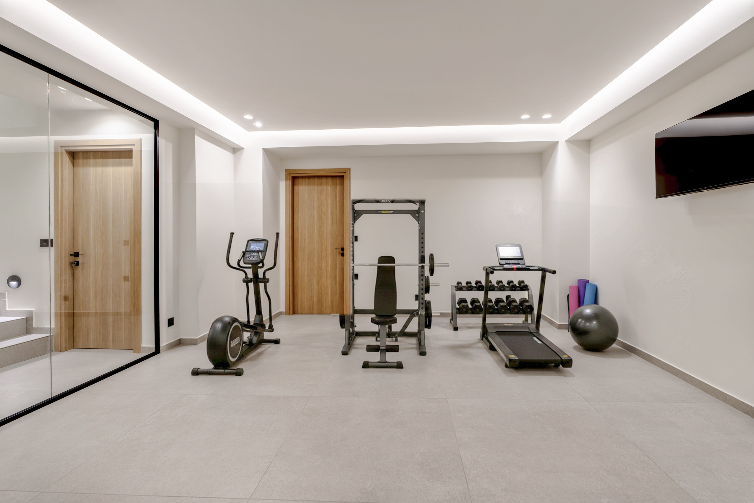 Zur Unterhaltung verfügt die Villa über einen separaten Kinosaal, ausgestattet mit einem riesigen Smart-TV, Netflix-Anschluss, einem Soundsystem und bequemen Sofas. Darüber hinaus können Gäste ihr Fitnesstraining im voll ausgestatteten Fitnessraum (Laufband, Crosstrainer, Multistation, Gewichte) fortsetzen oder sich in der Holz-Saunakabinenauf derselben Ebene entspannen, die von einem zusätzlichen vollständigen Badezimmer mit Dusche bedient wird.