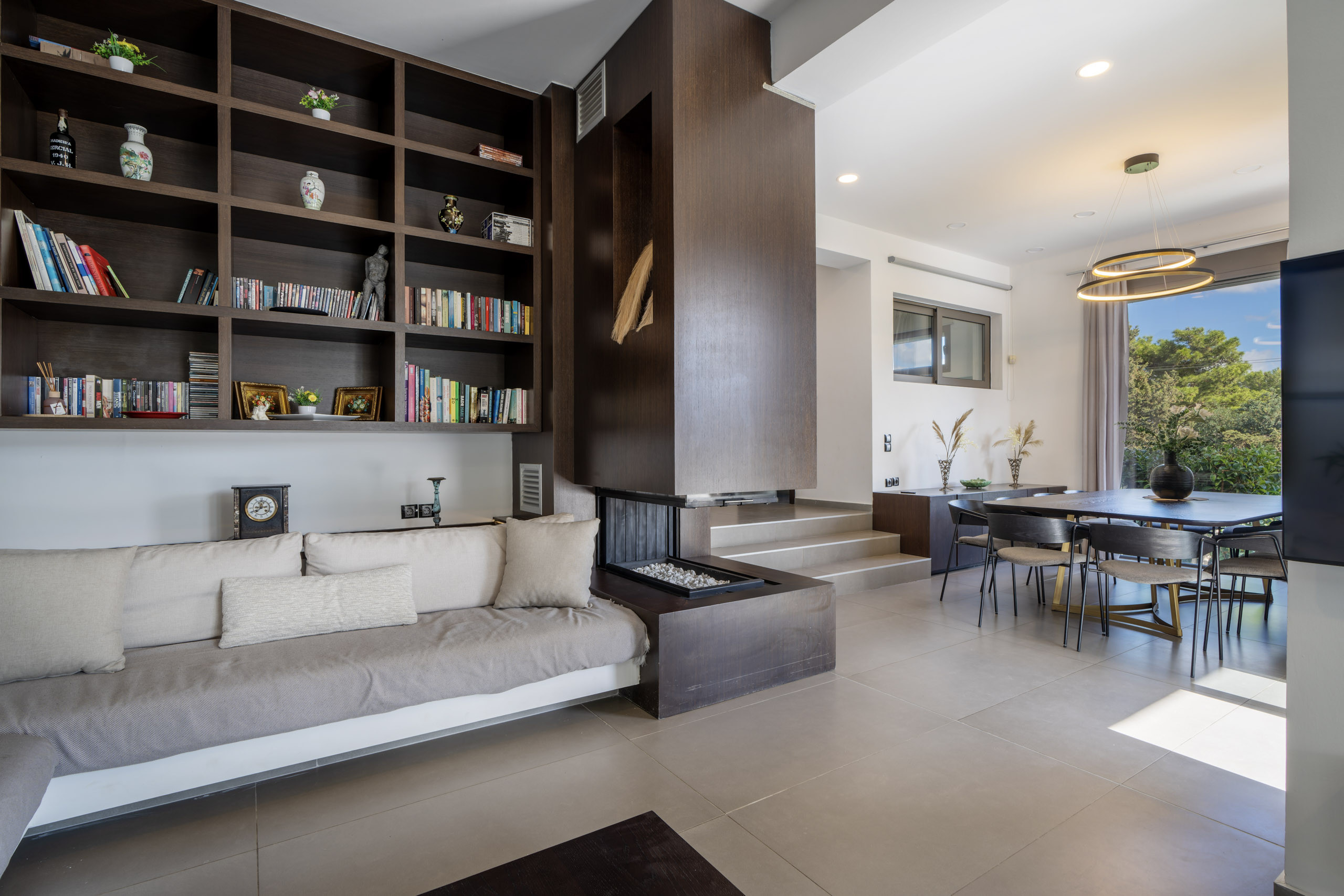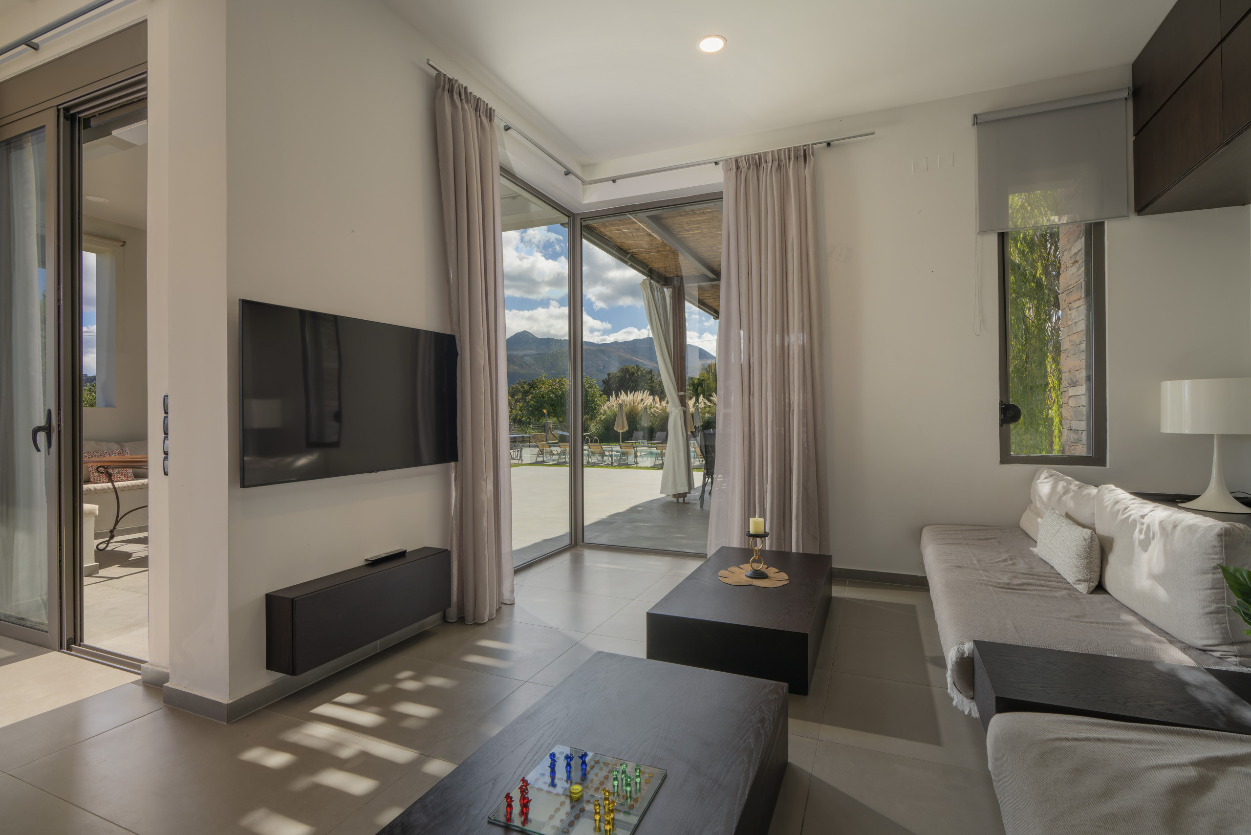 In der Lounge können die Gäste auf den bequemen Sofas entspannen und den unbegrenzten Blick auf den Pool und den Garten genießen, auf einem 49" Plasma-TV-Bildschirm mit Netflix fernsehen oder Musik hören. Der beeindruckende Energiekamin schafft ein Gefühl von Ruhe und Entspannung im Raum.