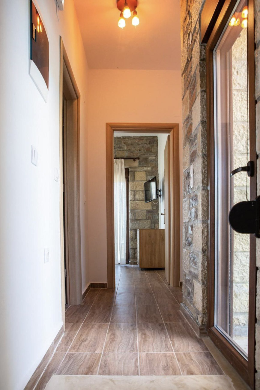 Das Innere des Hauses wird Sie mit seiner hohen Ästhetik begeistern und Ihnen das Gefühl geben, in den Komfort Ihres eigenen Zuhauses einzutauchen. Im Erdgeschoss gibt es einen eleganten offenen Wohnbereich mit bequemen Sofas, Kamin, Flachbild-TV und großen Fenstern für ungehinderte Aussichten auf den Pool und die umliegenden Berge, eine voll ausgestattete Küche mit Kühlschrank, Ofen und Herd, Geschirrspüler und allem, was Sie für die Zubereitung Ihrer Mahlzeiten während Ihres Aufenthalts benötigen, sowie einen Essbereich, um Sie und Ihre Lieben unterzubringen. Auf derselben Ebene befinden sich auch ein WC und ein Schlafzimmer mit einem großen Doppelbett.
