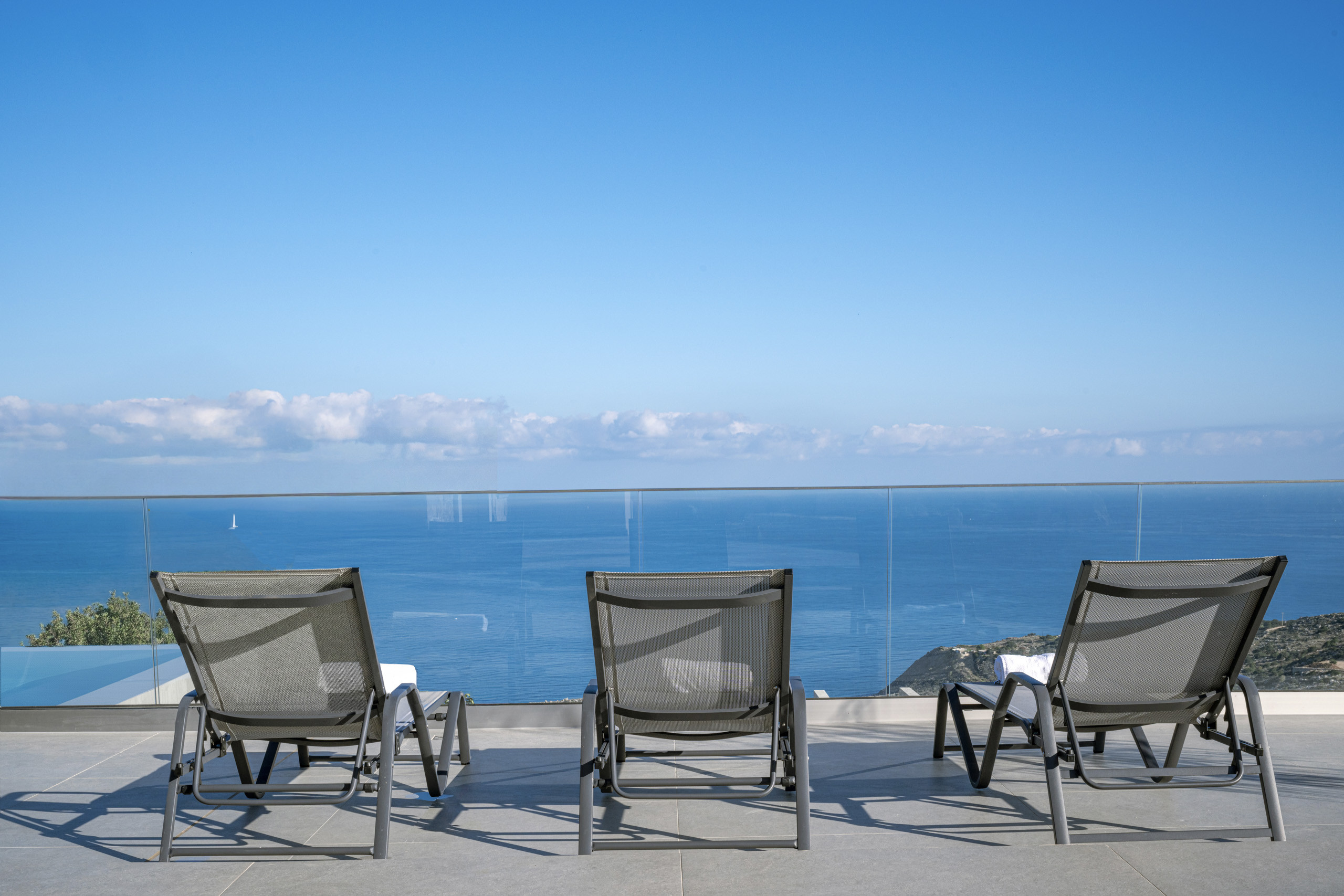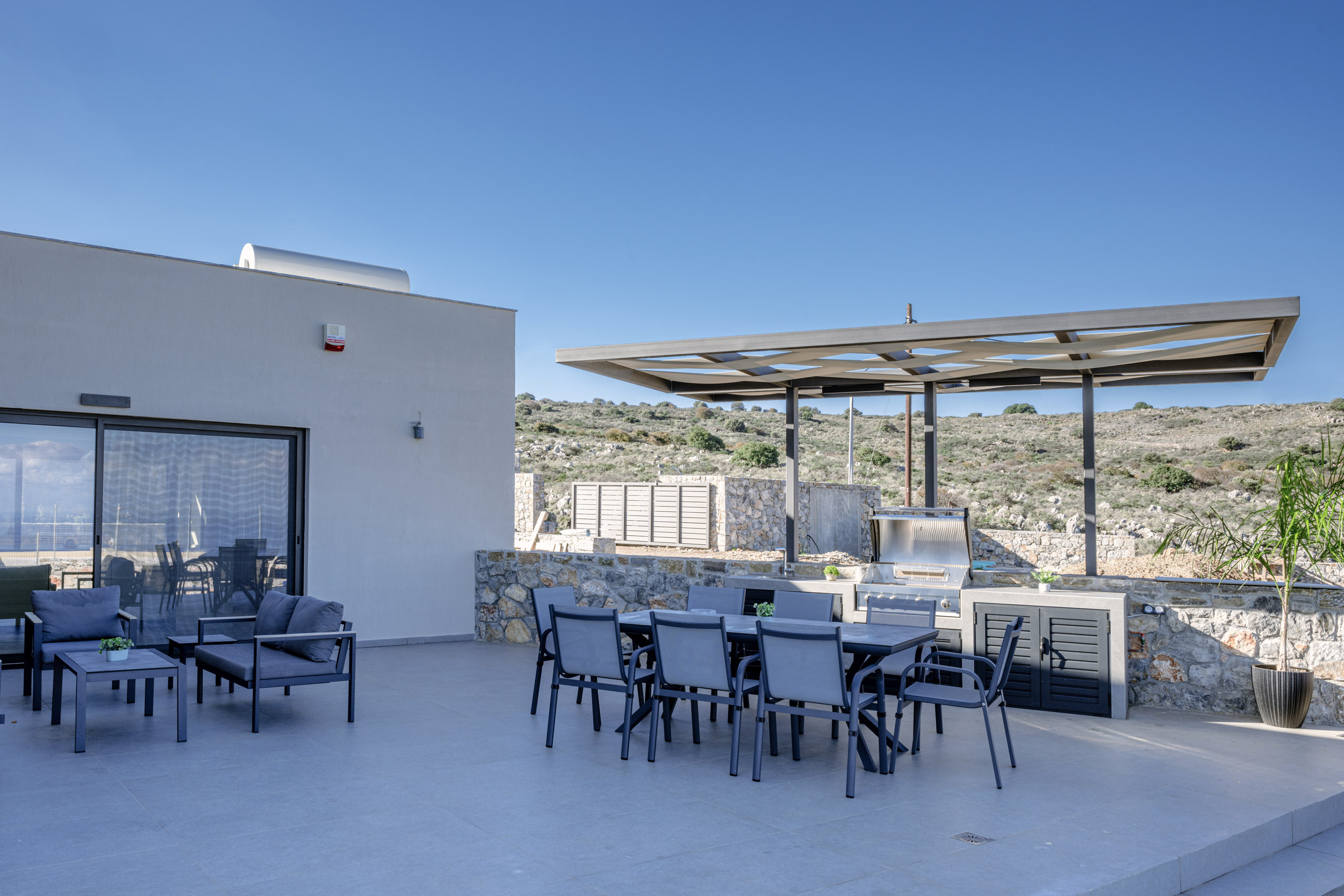 The villa’s outdoor area is thoughtfully designed for ultimate relaxation, seamlessly blending with the surrounding landscape. The impressive 80m² infinity pool features 4 submerged sun loungers for a truly luxurious experience, along with additional standard sun loungers. A cozy fire pit area with seating invites evening gatherings, while an extra outdoor lounge provides even more space to unwind. For alfresco dining, the villa boasts a BBQ with sink and a shaded dining table for 8 persons, perfect for enjoying meals with panoramic sea and hill views. The entire property is fenced for privacy and safety, with level ground throughout and no steps, ensuring easy access for all guests.