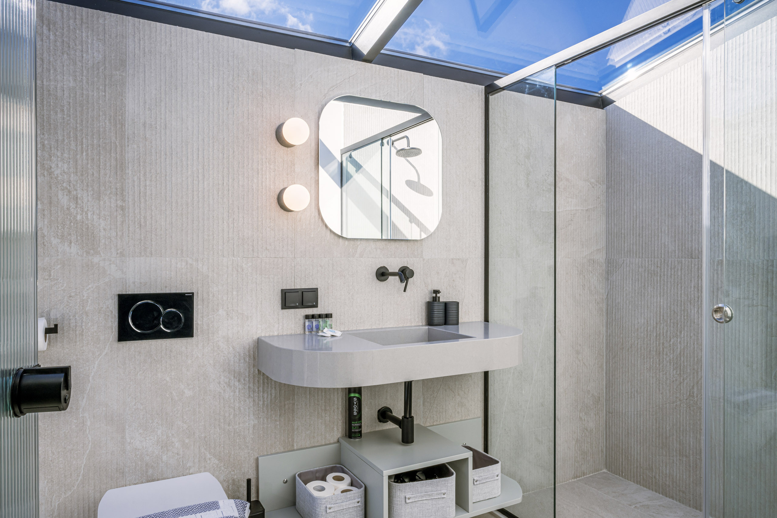 Indoors, the open-plan living area is bright and inviting, featuring a large Smart TV, a comfortable fireplace, and a dining area. The fully equipped open kitchen includes a breakfast bar where guests can enjoy casual meals. A sofa bed provides flexible sleeping arrangements for the extra guest. Three of the 4 bedrooms are located on the ground floor, each with an en-suite bathroom featuring a shower, air conditioning, and an open-style wardrobe for added convenience. The 4th bedroom is located in the attic (accessed via internal stairs), together with its own en-suite bathroom (also featuring a shower, air conditioning, and open-style wardrobe). Additionally, the 4th bedroom has a separate entrance, making it feel independent from the main house although attached.