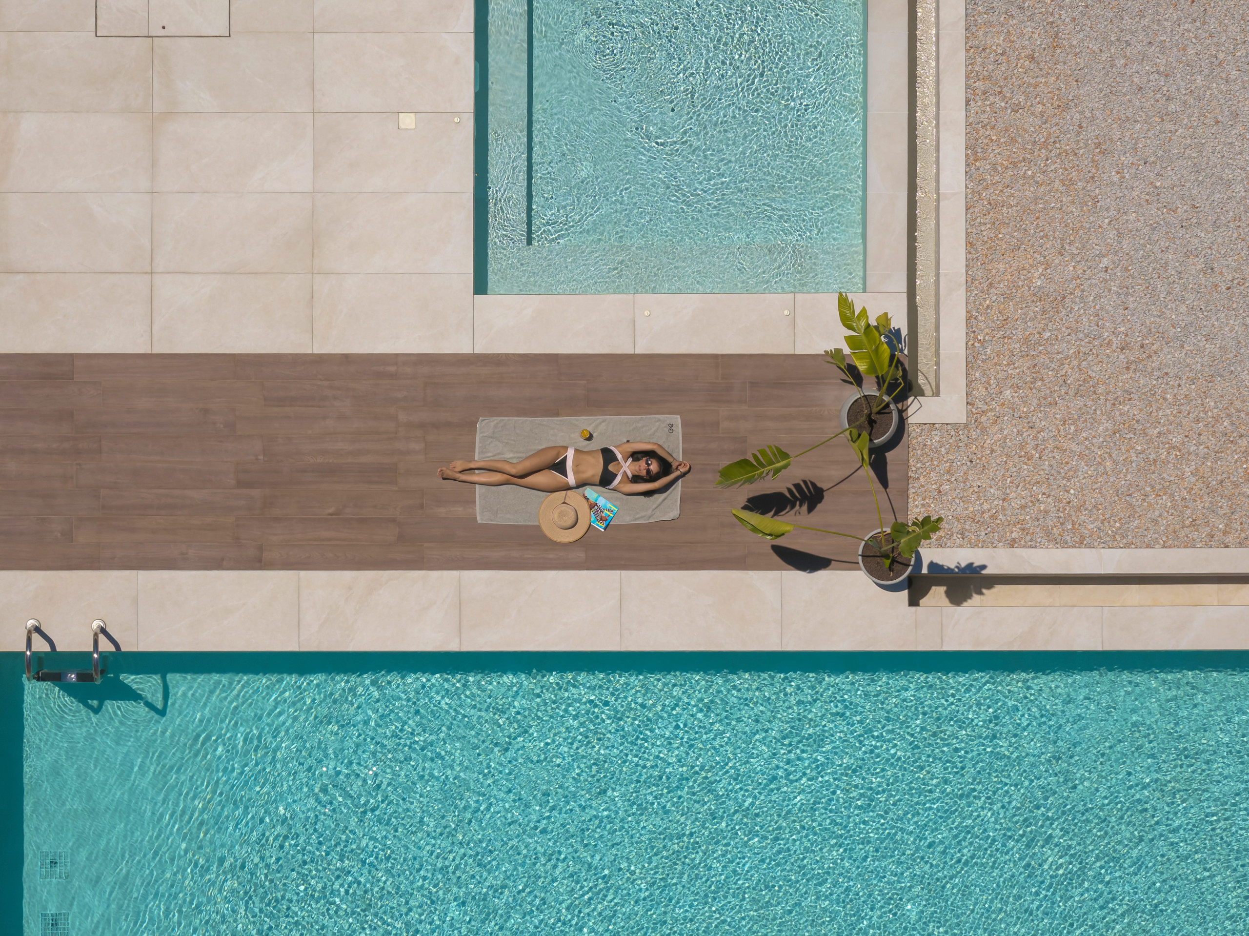 This floor also houses a serene bedroom with a double bed, Tv and wardrobe, featuring its own balcony overlooking the pool, and a bathroom with a shower. An internal staircase connects the main floor to the pool area, ensuring easy access for all.